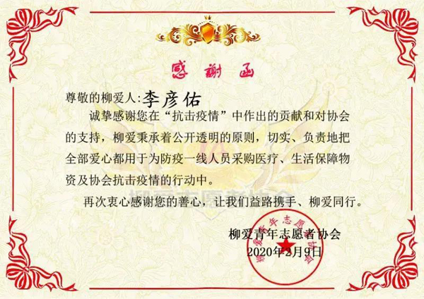 家住吉林省柳河县的2019级研究生李彦佑,作为当地“柳爱青年志愿者协会”的一员,和协会负责同志一起,为一线守城卫士送去一次性灭菌医用手套、帽子、酒精和暖贴暖宝等医疗、生活保障物资,每天晚上为一线设防人员送去热饮花生露、牛奶、方便面等,带去“柳爱人”的温暖问候。