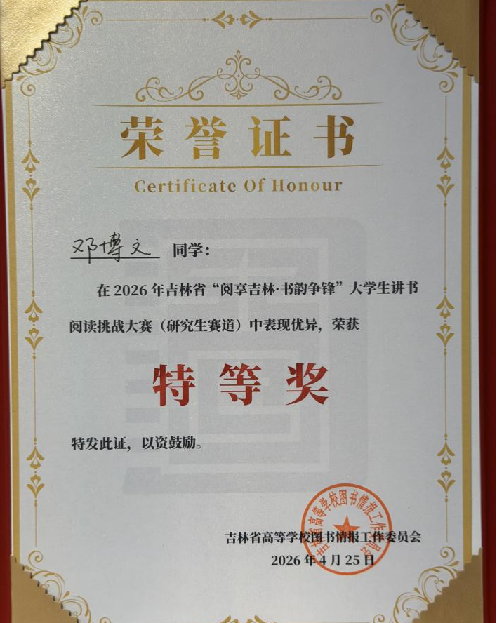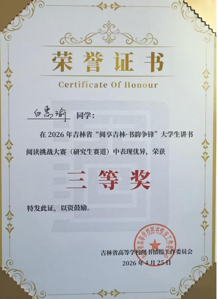 4月25日,2026年吉林省“阅享吉林·书韵争锋”老员工讲书阅读挑战大赛总决赛在吉林大学落下帷幕。304永利集团研究生在全省各高校参赛选手中脱颖而出,喜获佳绩。