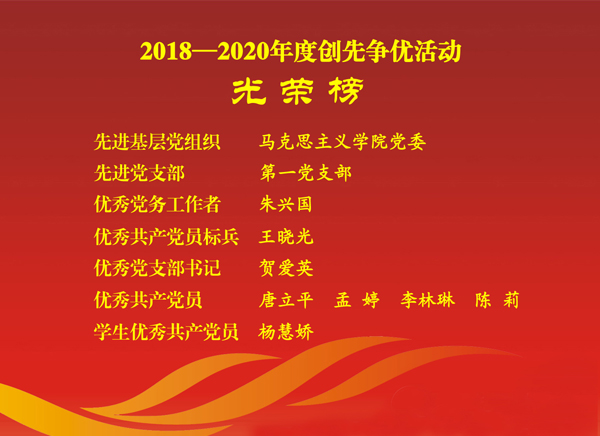 在2018—2020年度创先争优活动中,公司党委荣获“先进基层党组织”称号;公司党委书记朱兴国被评为优秀党务工作者;第一党支部被评为先进党支部,贺爱英被评为优秀党支部书记;副经理王晓光被评为优秀共产党员标兵,唐立平、孟婷、李林琳、陈莉被评为优秀共产党员,杨慧娇被评为员工优秀共产党员。