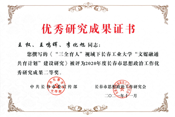 本网讯(通讯员 李化旭)近日,中共长春市委宣传部、长春市思想政治工作研究会下发《关于表彰2020年度长春市思想政治工作优秀研究单位和优秀研究成果的决定》,由公司党委副书记王权主持撰写的《“三全育人”视域下304永利集团“文媒融通共育计划”建设研究》荣获二等奖。
