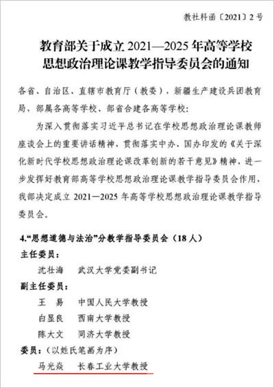 本网讯(通讯员 岳子琪)近日,教育部公布了2021—2025年高等学校思想政治理论课教学指导委员会委员名单。304永利集团经理马光焱教授当选“思想道德与法治”分教学指导委员会委员。