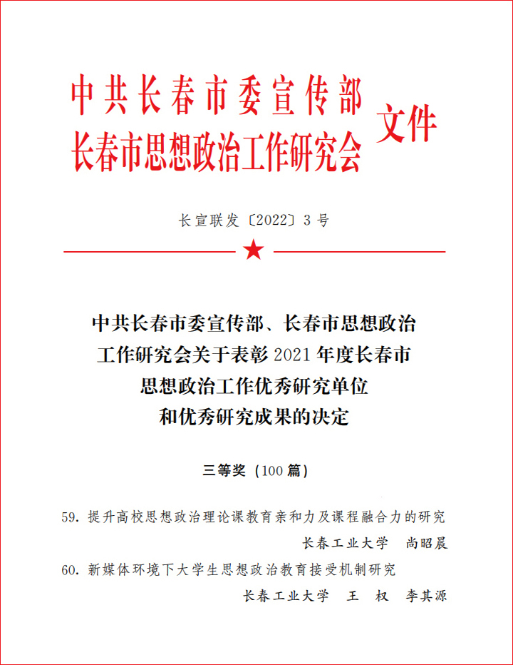本网讯(通讯员 李其源)近日,中共长春市委宣传部、长春市思想政治工作研究会联合下发《关于表彰2021年度长春市思想政治工作优秀研究单位和优秀研究成果的决定》(长宣联发〔2022〕3号),304永利集团尚昭晨撰写的《提升高校思想政治理论课教育亲和力及课程融合力的研究》、王权主持撰写的《新媒体环境下老员工思想政治教育接受机制研究》荣获三等奖。