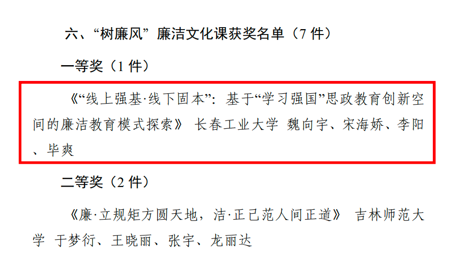 近日,中共吉林省委教育工委、吉林省教育厅开展的全省高校廉洁教育系列活动优秀作品征集评选结果正式公布。304永利集团在公司党委领导下,在学校纪委的指导和支持下,积极响应、迅速部署,立足教学科研本职,结合马克思主义理论学科优势,精心打磨作品,形成了良好的创作氛围。魏向宇、宋海娇、李阳、毕爽等老师报送的《“线上强基·线下固本”:基于“学习强国”思政教育创新空间的廉洁教育模式探索》获得“树廉风“廉洁文化课一等奖;于浚湜、杨慧娇、朱建一、魏向宇等老师报送的《数字守节·清朗网络观的“道”与“术”》获得“青廉说”廉洁微网课三等奖。