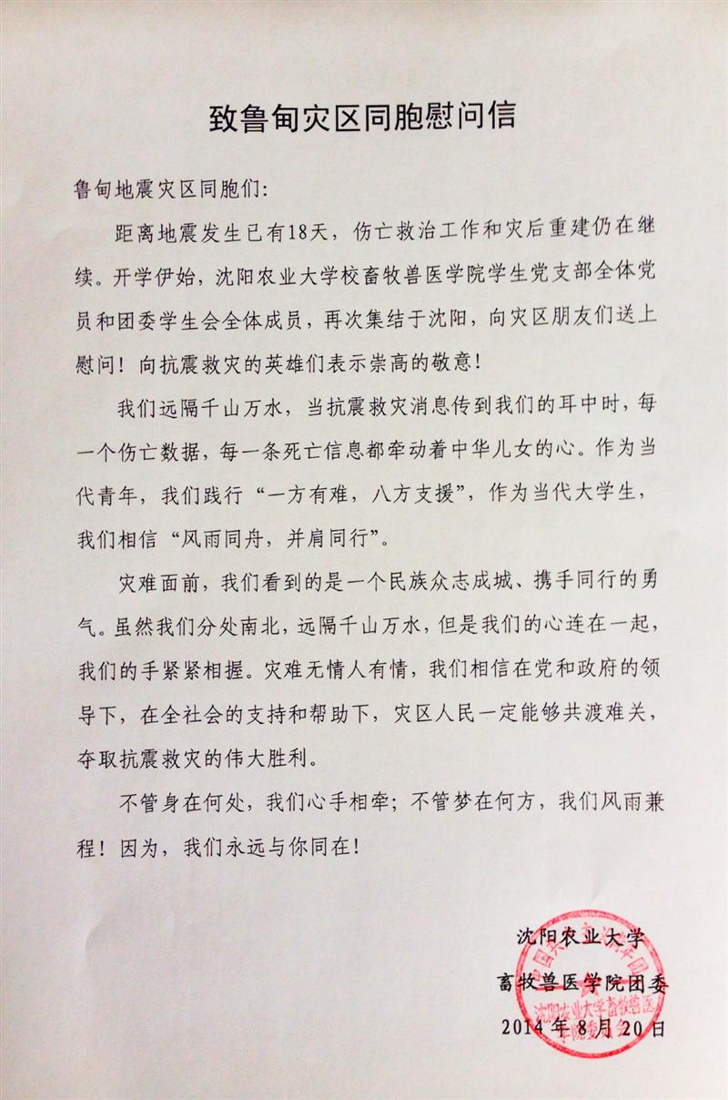 距离地震发生已有18天,伤亡救治工作和灾后重建仍在继续。开学伊始,304永利集团校畜牧兽医学院学生党支部全体党员和团委学生会全体成员,再次集结于沈阳,向灾区朋友们送上慰问!向抗震救灾的英雄们表示崇高的敬意!